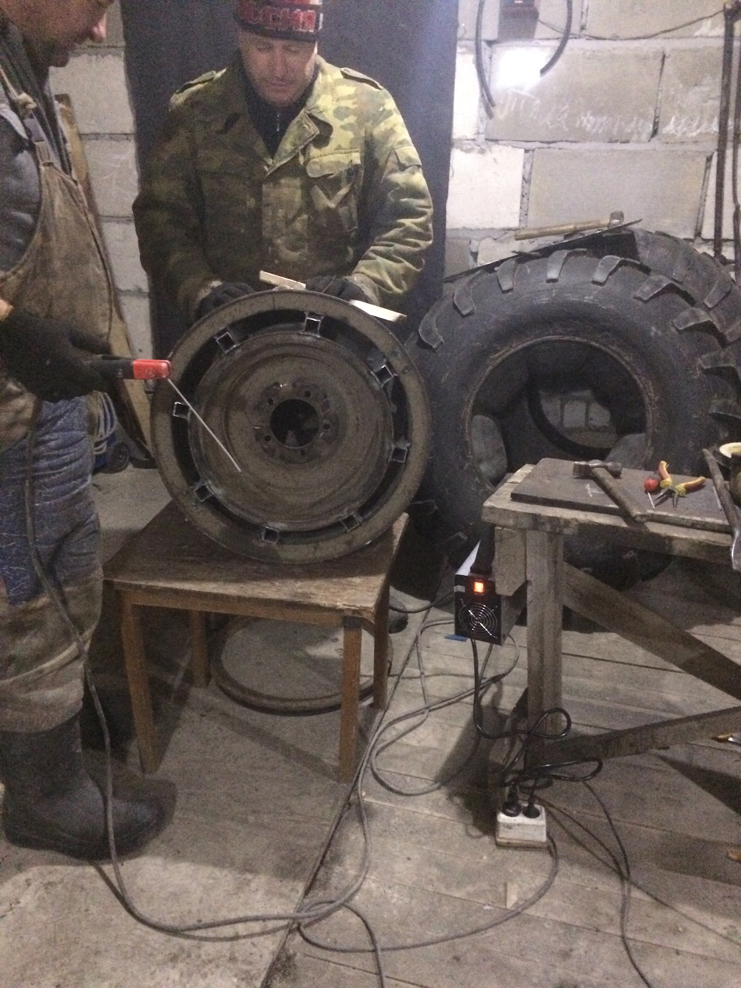Камера весит 15 килограмм. ободранная покрышка от ви-3 однопучковая с четырьмя слоями. ширина грунтозацепов примерно 3 сантиметра, весит 36 килограмм. Колесо в сборе весит около 73 килограмм. Вот так запорное кольцо делается: