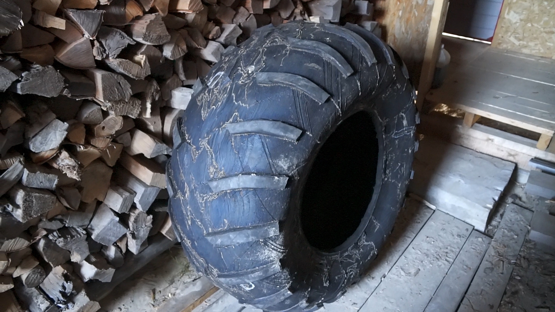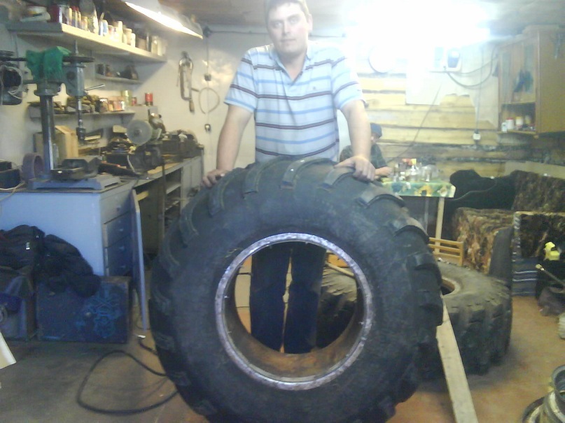 Колеса были слегка ободраны, но посадочное было не тронуто и проволока не доставалась. Как видно протектор нарезается елкой с ребордой.В это же время автор делал глушитель для своего вездехода. Длинна глушителя составляет 400 мм, диаметр 10.5 сантиметра. для придания жесткости последнюю банку автор сделал эллипсом. первая же и вторая банка сделаны толстостенными.