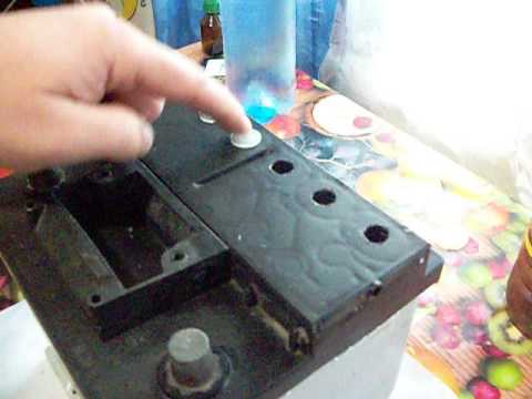 Если зарядное простое — выставляем ток примерно 0.1 от емкости. Аккумулятор 60 А/ч нужно заряжать током в 5 — 6 Ампер. зарядка длится. пока показатели на амперметре не снизятся до 2-3 ампер. Сильно разряженный аккумулятор нужно заряжать током 1-2 ампера ( около 1/20 емкости) несколько суток. Напряжение не должно превышать 15 вольт, иначе банки будут «кипеть» и могут раздуться. - Просверливаем отверстия в крышке аккумулятора. Проверяем уровень электролита при помощи импровизированного щупа.. Если корпус АКБ изготовлен из светлого пластика, то уровень можно проверить, просвечивая аккумулятор фонариком.