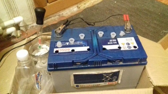 Возможны три варианта коррекции плотности электролита:- При нормальном уровне низкая плотность. Отбираем ареометром все содержимое банки, сливаем ее в стеклянную емкость.