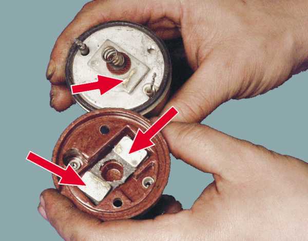 После снятия крышки вы сможете оценить состояние контактных пластин. Нагар или окисление следует удалить, воспользовавшись наждачной бумагой. Повреждённые пружины, если таковые имеются, можно попытаться заменить, подобрав подходящие по размеру и характеристикам. Подбор пружин – дело весьма сложное. Приходится замерять не только размеры, но и развиваемое усилие. Сделать это, не имея в своём распоряжении специального оборудования, не получится.