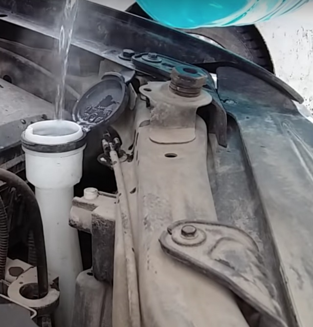 6. По приезду еще раз открываем капот и доливаем нашу подогретую незамерзающую жидкость для стекол. Все мы знаем из уроков физики, что вода при замерзании расширяется. Машину прогрели, теплую незамерзайку залили, пока ехали часть льда растаяла, а следовательно эта часть воды перешла из твердого в жидкое состояние, тем самым уменьшившись в объеме.