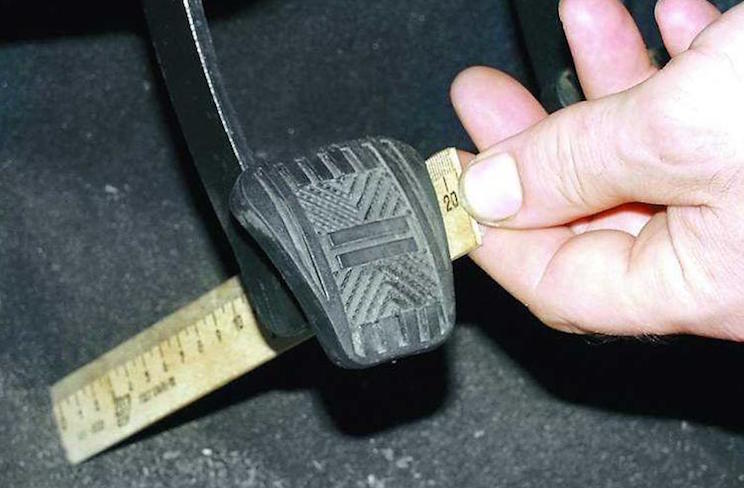 Не меняя положения линейки, нажмите упором на педаль до появления ощутимого сопротивления, выбрав полный свободный ход педали. Определите по линейке перемещение педали, которое и будет полным свободным ходом педали.