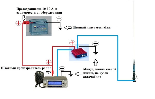 Для улучшения качества приема используется отдельный усилитель сигнала, который врезается в соединительный кабель. Электрическая схема подключения устройства включает в себя положительный и отрицательный провода. Минусовой сигнал поступает от кузова автомашины или металлического силового каркаса панели приборов. Плюсовой кабель подсоединяется к ближайшему переключателю. Но при выключенном зажигании антенна не работает, поэтому рекомендуется коммутировать провод напрямую к штекеру магнитолы.
