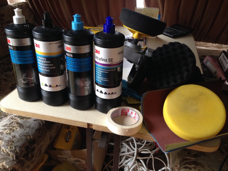 Вы выбрали правильные материалы.Но прежде чем самостоятельно полировать машинку, необходимо сначала ее хорошенько подготовить. Сначала вымойте и просушите кузов автомобиля. Удалите следы мошек, битум и антикор. Можно использовать специальные составы или обычный уайт-спирит. Если вы полируете на открытом воздухе, то выбирайте несолнечную погоду, без дождя, с комфортной температурой. Если есть возможность, полировку лучше проводить в гараже или специальном ящике с хорошей вытяжкой. Обеспечьте хорошее освещение, иначе некоторые дефекты могут остаться незамеченными. Глубокие царапины и сколы зарезать до грунтовки специальной лентой.