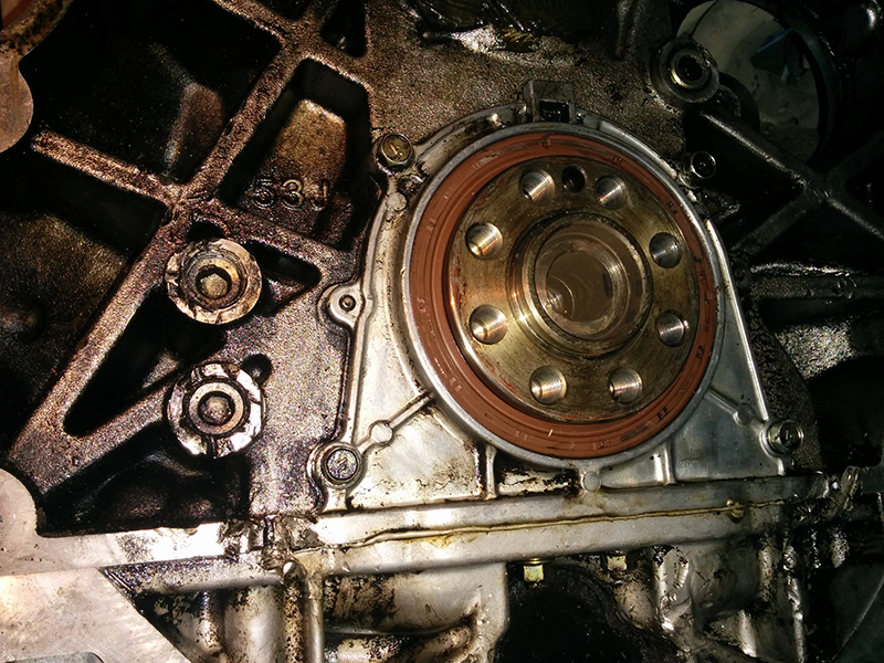 На переднеприводных автомобилях двигатель обычно устанавливается по диагонали, поэтому задняя часть двигателя находится на стороне, противоположной стороне с промежуточными шкивами, натяжителями и поликлиновым ремнем. Утечку моторного масла из-под заднего сальника коленчатого вала трудно диагностировать, за исключением случаев, когда вы работаете с редуктором, как я, потому что масло обычно капает из того места, где трансмиссия соединяется с двигателем, и капает в другом месте, например, в картере.