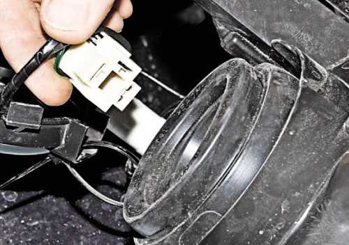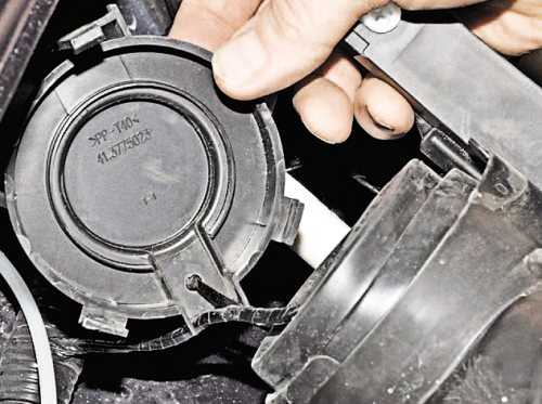 Для более удобного доступа к левой фаре (по ходу движения автомобиля) рекомендуется сдвинуть корпус воздушного фильтра двигателя в сторону, освобождая все его крепления, жгут проводов и датчик.