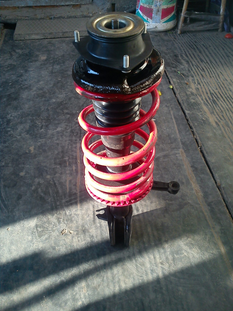 Я использовал магазинные тиски для поддержки сборки.С помощью инструмента для сжатия пружины ослабьте натяжение пружины между нижним и верхним седлом пружины. Чтобы снять опору стойки, я использовал ударную головку с тонкой стенкой 19 мм для снятия верхней гайки. Его размер может варьироваться в зависимости от марки установленной вставки стойки. Вставка была утиль, поэтому я использовал тиски, чтобы зажать вал поршня, чтобы предотвратить его вращение. Никогда не делайте этого, если вы планируете повторно использовать вставку, поскольку она поцарапает обработанную поверхность, что, в свою очередь, разрушит маслосъемное уплотнение амортизатора, вызывая утечки