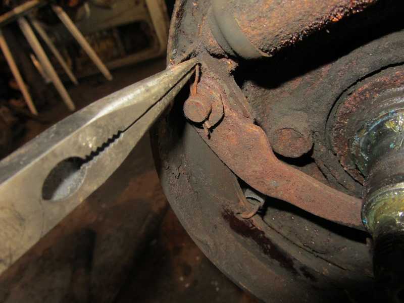 Переустанавливайте его, пока он не вернется в багажник. Повторите этот шаг с противоположной булавкой. Нам также придется удалить наши прокладки здесь. Теперь, если они все проржавели, потрескались и сломались, вам придется заменить их новыми, но наши выглядят довольно хорошо. Мы просто возьмем стальную проволочную щетку и удалим с них всю эту коррозию. Они не обязательно должны быть идеальными, если они гладкие и чистые, без грязи и мусора, а также любых заусенцев или трещин. Всякий раз, когда вы делаете что-то подобное со своими тормозами, вам захочется надеть пылезащитную маску и очки, чтобы весь этот мусор не попадал вам в глаза и легкие.