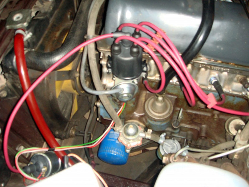 Присоединяем трамблер к двигателюЗакрепляем трамблер, но гайки до конца не затягиваем, так как потом будем устанавливать угол опережения зажигания и будет необходимо вращать трамблер. Устанавливаем на место крышку и затягиваем два винта ее крепления. Присоединяем к ней высоковольтные провода в правильном порядке.