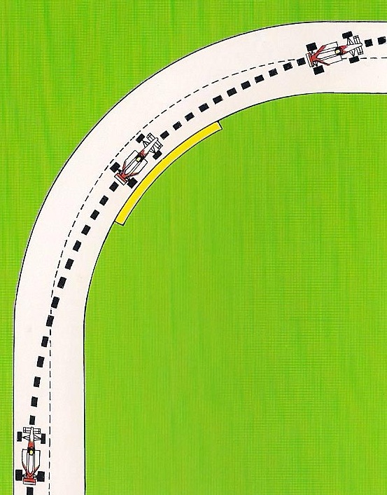 Для построения такой траектории автомобиль в начале поворота смещается ближе к наружней стороне дороги, затем проходит апекс (точка, в которой автомобиль располагается ближе всего к внутреннему краю дороги), а выход из поворота проходит вновь по наружнему краю дороги.