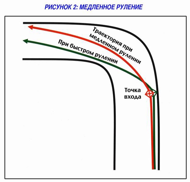 2. Работа с рулем в поворотеСамая безопасная тактика работы с рулем в повороте — когда в самом начале поворота руль сразу поворачивается на нужный угол и на выходе из поворота его нужно лишь плавно вернуть в положение прямых колес.