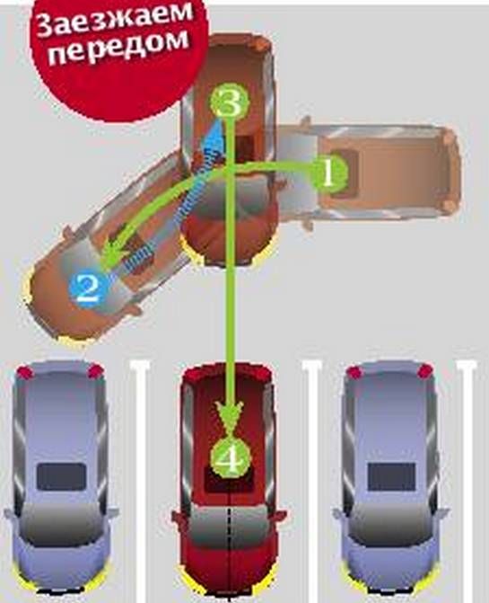 В том случае, когда расстояние между машинами большое, либо задняя машина стоит далеко, можно въехать на парковочное место передним ходом. Такая ситуация возможна, на пустых дорогах, либо во дворах в рабочее время дня.