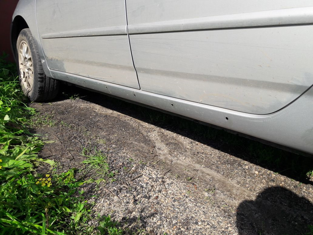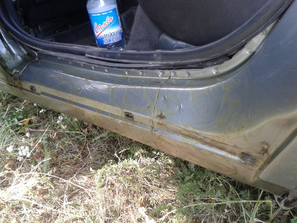 - Тщательно моем машину. Это не просто формальность, вам просто необходимо оценить состояние порогов на автомобиле. Если есть сквозные дыры из-за ржавчины, то пороги целесообразно заменить полностью. И еще один важный момент: какое бы средство для обработки вы не выбрали, наносить его нужно на чистую и абсолютно сухую поверхность.