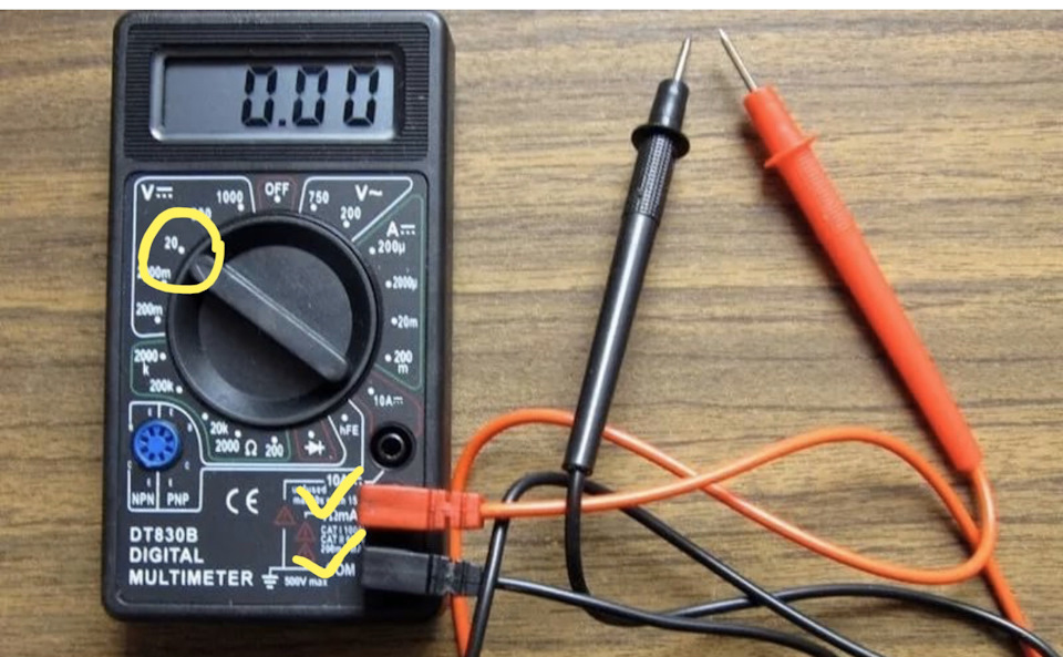 Возьмите вольтметр и подключите положительный полюс к положительной клемме аккумулятора.