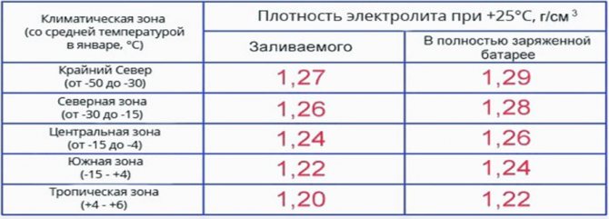 Поэтому измерение плотности принято проводить при 25 °С и полностью заряженном аккумуляторе. Плотность электролита в новой полностью заряженной батарее должна составлять 1.28±0.01 г/см3 для Средней полосы. Но может варьироваться в зависимости от климатической зоны.