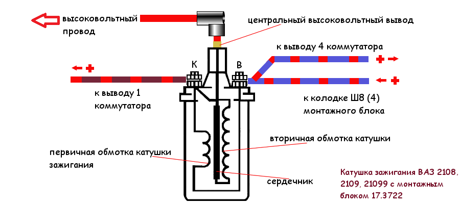 В катушке зажигания имеются две обмотки, которые намотаны на пластинчатый металлический сердечник. Первичная обмотка, имеющая несколько сотен витков, соединена с двумя внешними контактами катушки. Положительный вывод (+) катушки подключен к выключателю зажигания и АКБ, а отрицательный вывод (-) – к модулю зажигания и затем на «массу» кузова. Вторичная обмотка имеет несколько тысяч витков и подсоединена одним концом к положительному контакту первичной обмотки, а другим – к высоковольтному выводу в центральной части катушки.