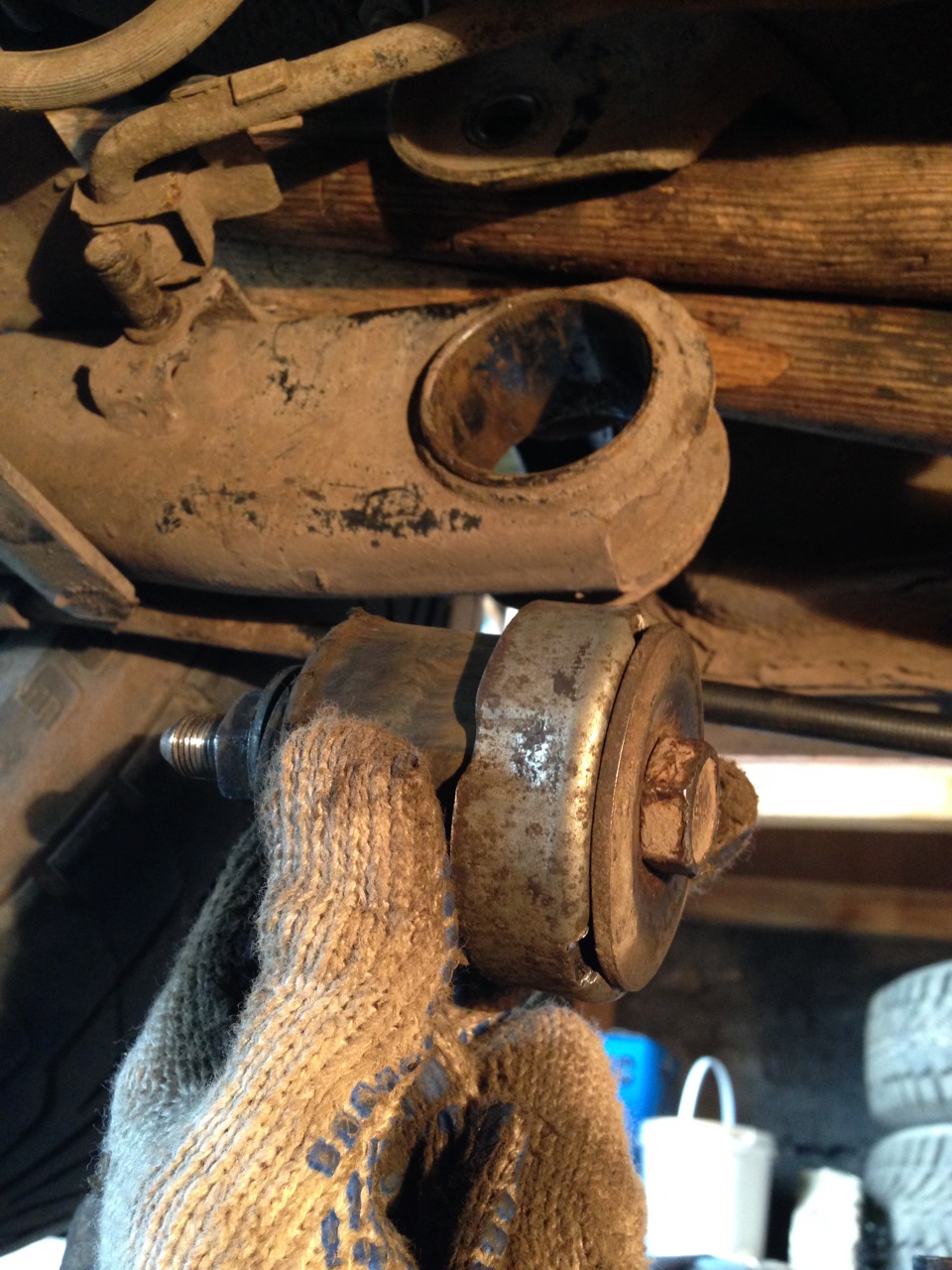- Выкручиваем гайки, которые служат для фиксации передних рычагов. Откручиваем ключом №17 гайку, с помощью которой стабилизатор крепится к рычагу, и достаем болт с помощью молотка (вручную снимать очень сложно).