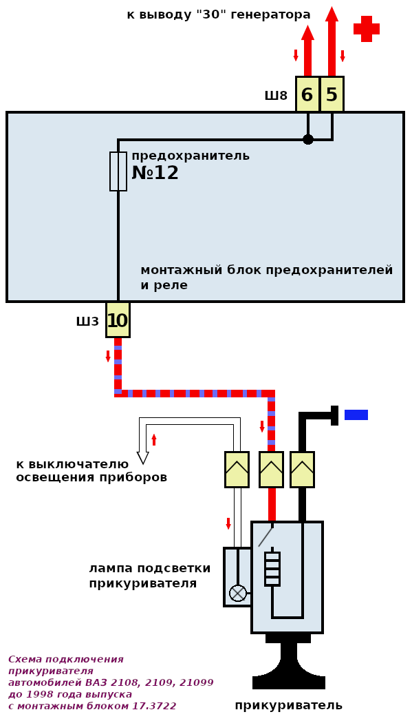 На центральный контакт 1 подают напряжение питания + 12 Вольт через предохранитель номиналом 10 – 30 Ампер (зависит от типа прикуривателя и марки автомобиля). Рабочий элемент 9 обычно выполнен из спиральной нагревательной нихромовой пластины. Его центральный контакт соединяется с контактом 1 (напряжение питания) после нажатия на кнопку 6 съемного элемента прикуривателя 5.