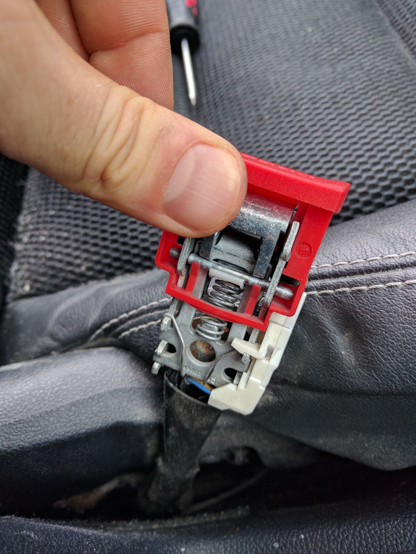 Разъёмный элемент конструкции точки крепежа обеспечивает удобное расположение лямок ремня безопасности. Принцип работы прост – металлический язычок с отверстием, крепящийся на ремне, вставляется в замочное отверстие и фиксируется штифтом, чтобы застегнуть конструкцию.На корпусе замка располагается кнопка, с помощью которой осуществляется втягивание штифта и происходит разъединение элементов.