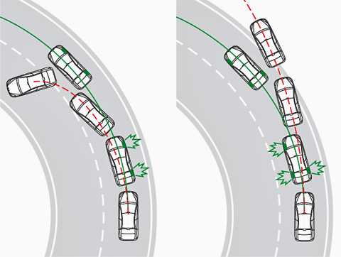 На данной картинке показаны линии вероятного движения автомобиля при превышении максимально допустимой скорости вхождения в крутой вираж на трассе. При повороте руля начинается занос машины. На левом рисунке красным пунктиром показана линия движения автомобиля без ESC при торможении водителем (машину разворачивает поперёк с выездом на встречную полосу). На правом рисунке красным пунктиром обозначена траектория движения без торможения, когда машину выносит в кювет. Зелёной линией и факелами на обеих картинках обозначены траектория движения автомобиля, оборудованного системой ESC, и колёса, которые автоматически подтормаживаются системой при появлении заноса.