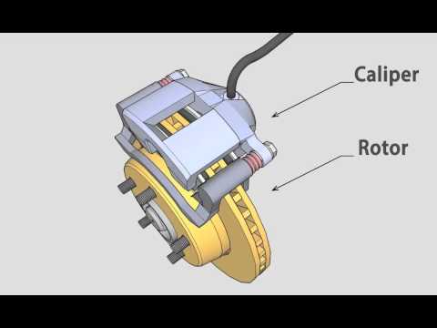 Гидравлическое давление, передаваемое системой, прижимает один или несколько поршней внутри каждого тормозного суппорта к тормозным колодкам. Это давление заставляет тормозные колодки воздействовать на тормозной диск, в результате чего трение от контакта тормозных колодок и дисков вызывает замедление . - Система стояночного тормоза , воздействующая на задние суппорты, работает с помощью механического рычага . Задние тормозные суппорты работают как гидравлически, так и механически. Рычаг тормоза рядом с сиденьем водителя напрямую связан с колесным тормозом.