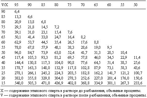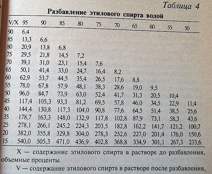 Количество воды указано на 100 частей спирта. Например, для приготовления 40 градусного напитка из 95% спирта необходимо взять 144,4 мл воды и 100 мл спирта.