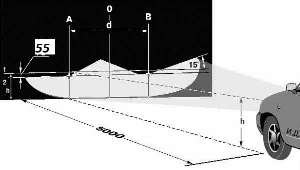 - Расстояние А между линиями 1 и 2 должно быть равно расстоянию между центрами ламп ближнего света фар.