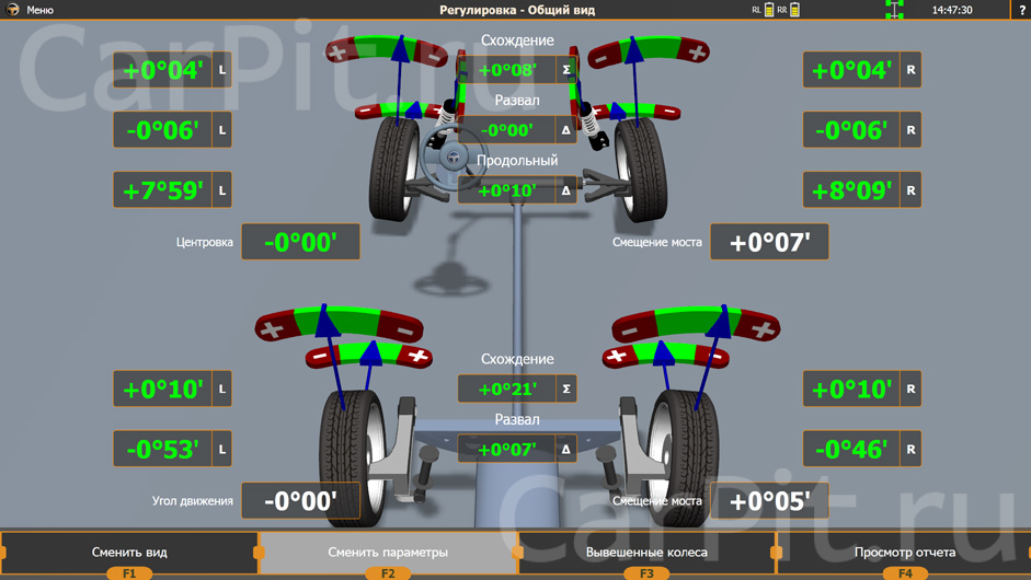 Программное обеспечение может отслеживать точки перемещения колес, анализировать их и сравнивать с моделью-эталоном. Это позволяет быстро и грамотно выставлять углы.