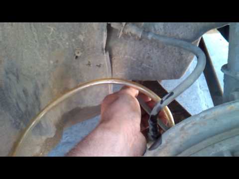 Этого можно добиться с помощью виниловых трубок и импровизированного резервуара для жидкости, такого как двухлитровая бутылка из-под газировки с отверстием, просверленным в крышке. Вставив трубку в бутылку с другим концом, прикрепленным к выпускному клапану, взломайте клапан и инициируйте поток старой жидкости. Затем войдите в машину и нажмите на тормоз пять-семь раз, пока в магистрали не останется воздуха или пузырьков. Просто затяните выпускной клапан после того, как воздух будет удален, и переходите к следующему колесу.