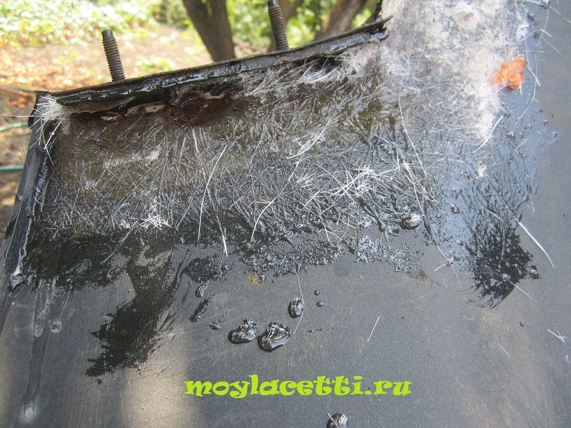 - Подготавливают к использованию полиэфирную смолу согласно инструкции, которую можно найти на упаковке с материалом. Затем смолу намазывают на обратную сторону деформированной области, захватывая площадь размером 50 мм вокруг дефекта.