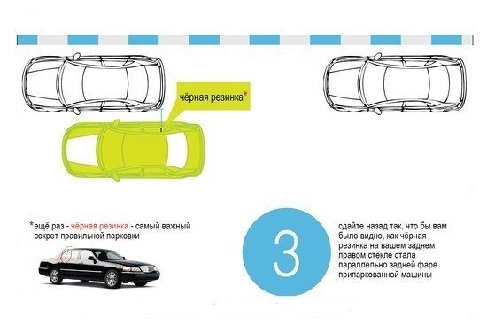 При повороте задним ходом хвостовая часть кузова уходит вправо, а капот налево. Радиус поворота переда машины намного больше радиуса задней части. Это следует учитывать, чтобы не задеть рядом стоящие автомобили.