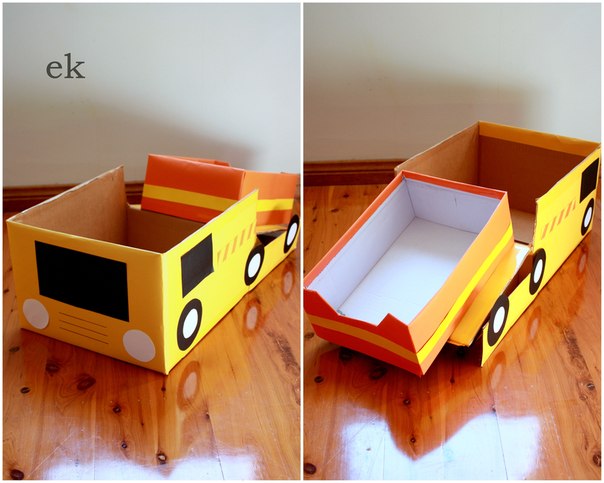Любой мальчик обрадуется самосвалу. Он состоит из закрытой картонной коробки, в которой располагается «кабина» с пластилиновым шофером, и из коробки большего размера, но без крышки. Эта коробка исполняет роль кузова, в котором можно перевози, например, кубики. Кабину и кузов желательно скрепить таким образом, чтобы кузов мог легко откидываться.