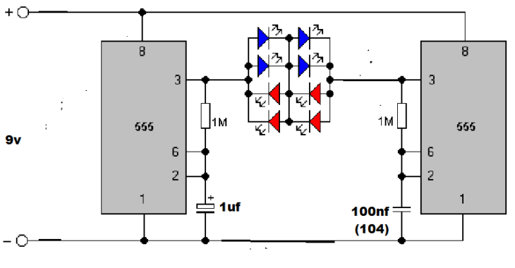 Сделать стробоскоп на светодиодах можно по нескольким схемам. Одной из самых простых и доступных является следующая: