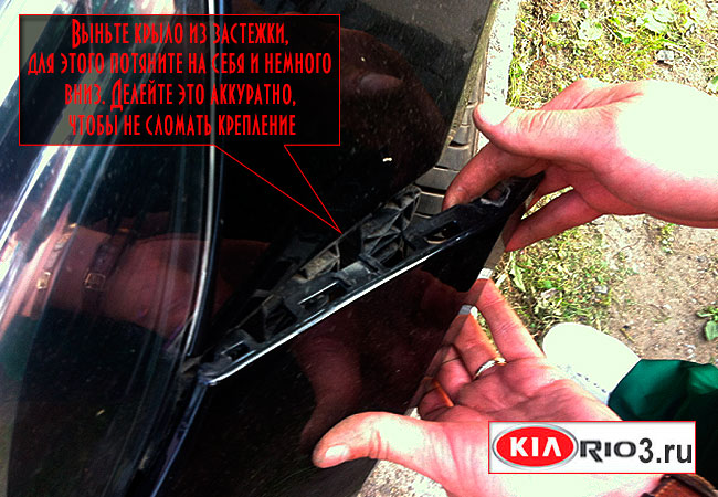- Теперь следует отстегнуть крепления, которые крепят бампер к крылу. Для этого нужно легко потянуть крыло на себя и слегка вниз.