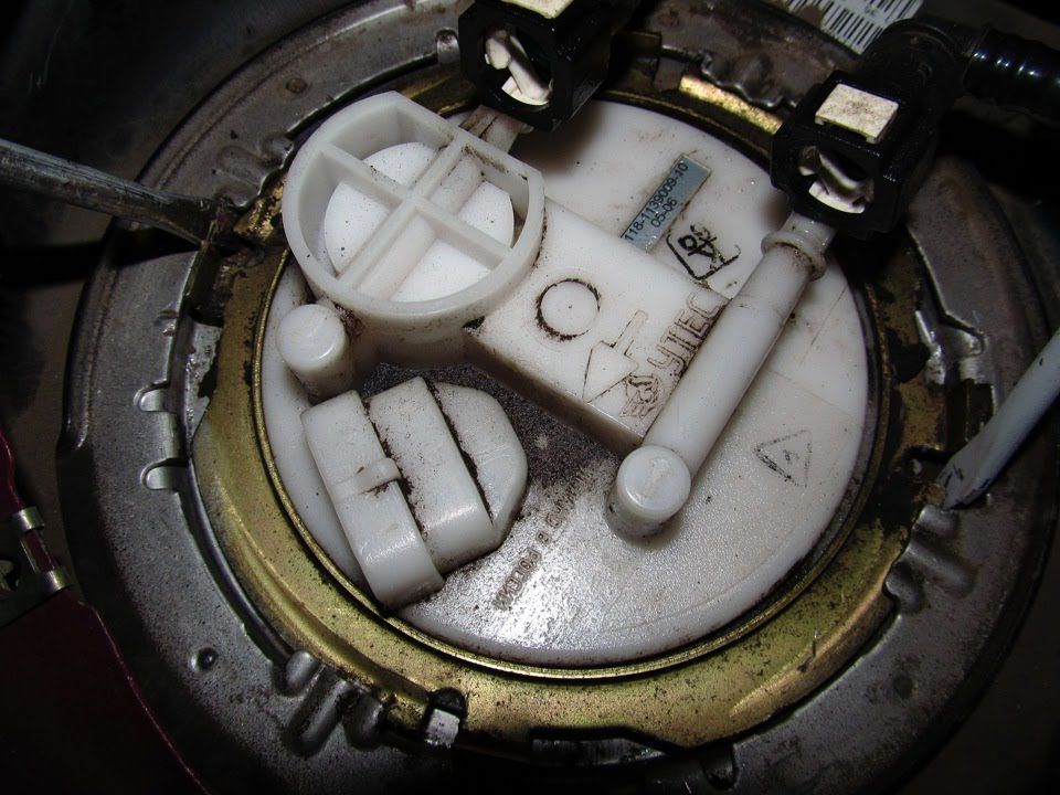 После снятия кольца можно доставать бензонасос из бака. Во время снятия следует соблюдать аккуратность, так как к корпусу бензонасоса могут быть прикреплены устройства для определения уровня топлива в бензобаке (датчик-поплавок).