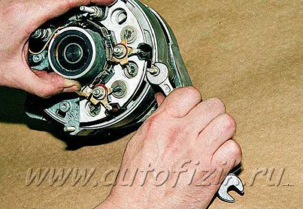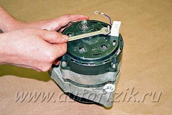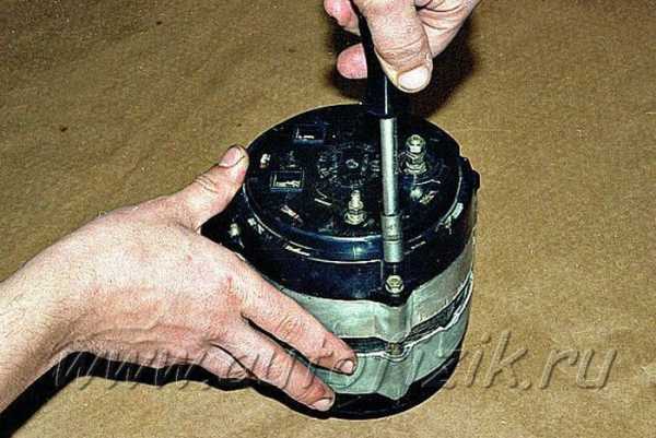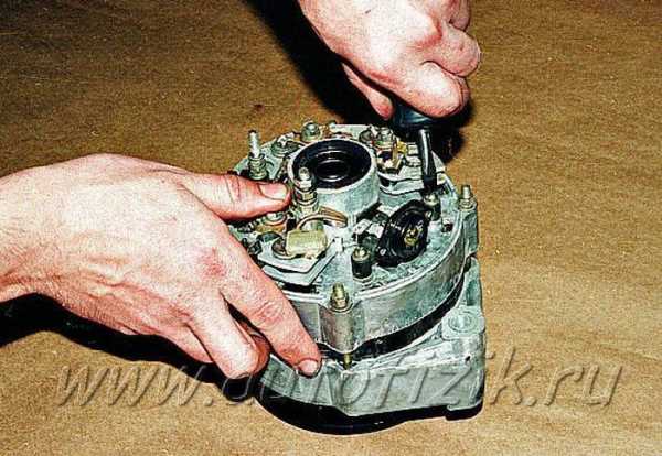 Итак, для начала необходимо снять с корпуса пластиковую защитную крышку. Затем открутить блок щеток и регулятор напряжения, предварительно отсоединив от него проводку. Далее следует выкрутить четыре стяжных шпильки корпуса генератора и демонтировать крышку корпуса совместно со статором. Затем, отсоединив клеммы обмотки от диодного моста, нужно снять статор, а при надобности и сам диодный мост.