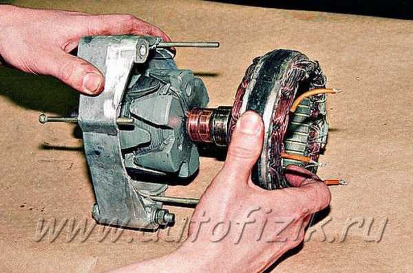 Что нужно, сначала нужно снять с корпуса пластиковую защитную крышку. Потом открутить блок щеток и регулятор напряжения, за ранее отсоединив от него проводку. Дальше следует вывернуть четыре стяжных шпильки корпуса генератора и демонтировать крышку корпуса вместе со статором. Потом, отсоединив клеммы обмотки от диодного моста, необходимо снять статор, а имея необходимость и сам диодный мост.