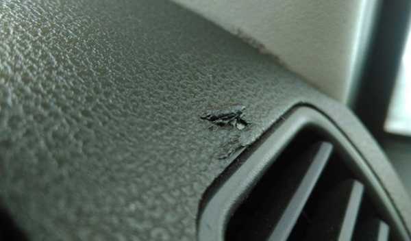 - Другой тип повреждений в салоне машины связан с воздействием УФ лучей на пластиковую поверхность. Как вариант, поверхность торпедо под воздействием солнца теряет цвет, становится блеклой, что никак не привносит солидности машине в сочетании с царапинами. Данная ситуация наиболее проблематичная и требует полной замены поверхности салона.