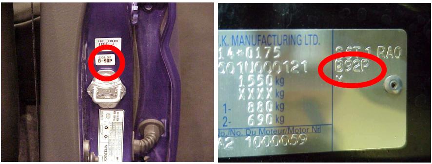 Kia очень похожа на Hyundai, наклейка почти всегда находится в косяке двери со стороны водителя. В правом верхнем углу наклейки вы должны увидеть слово «Краска», за которым следует двухзначный код краски.