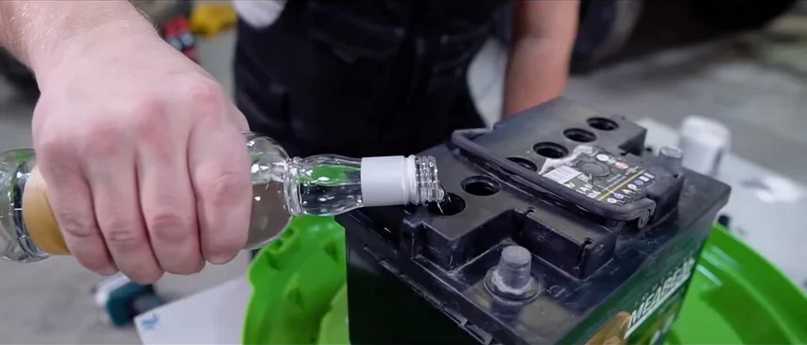 - Шаг 6. Моем аккумулятор пару раз дистиллированной водой, после чего заливаем новый электролит. Следим, чтобы он имел нужную плотность.