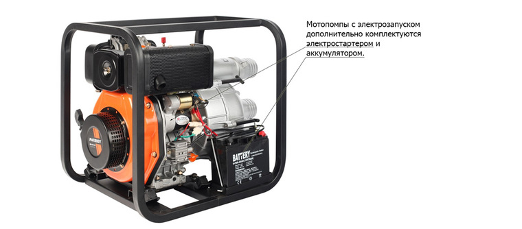 Большинство мотопомп оборудовано веревочным стартером для ручного пуска. При соблюдении условий эксплуатации, пуск двигателя с помощью такого стартера затруднений не вызывает. Но если запускать двигатель приходится часто, то наличие электростартера может заметно облегчить работу с помпой. С другой стороны, электростартер заметно увеличивает цену и вес мотопомпы.