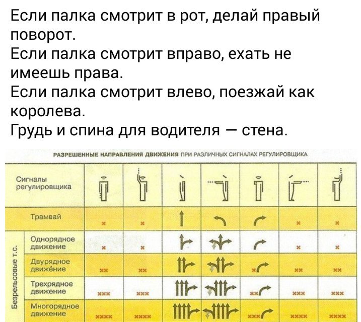 Простой пример. На теоретическом экзамене абитуриенты нередко сыплются на вопросах о трактовке сигналов регулировщика. Скажем, регулировщик стоит к вам боком, указывая жезлом влево от вас. Можно ли ехать прямо или надо поворачивать в направлении, указываемом жезлом? А как насчёт правого поворота в такой ситуации? Действительно, здесь можно и запутаться. А можно запомнить небольшой стишок: