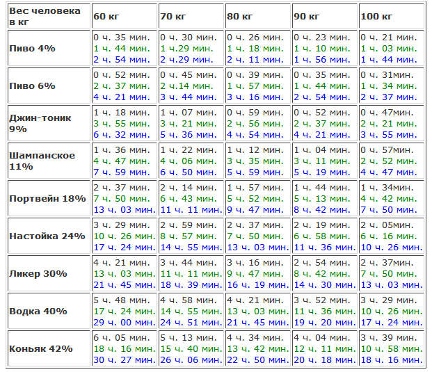 - Вес и пол. У мужчин за 1 час перерабатывается 0,15 промилле, у женщин за это время всего 0,1 промилле. Это потому, что мужской пол содержит на 10-20% больше воды. Например, вес у обоих составляет 70 кг, то согласно биологии мужчины ему понадобится 30 минут, чтобы очистить кровь после выпитых 100 г хмельного крепостью 4%. Если крепость напитка составляет 6%, то выветривание алкоголя займет целых 50 минут. Женщины тратят немного больше времени;