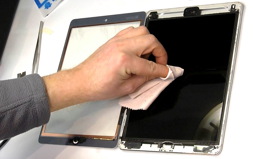 Далее на матрицу наносится клей и соединяется с сенсором, при этом совмещение нужно осуществлять максимально точно для корректной работы в дальнейшем; - Клей засыхает под действием УФ-лампы на протяжении до 30 минут;