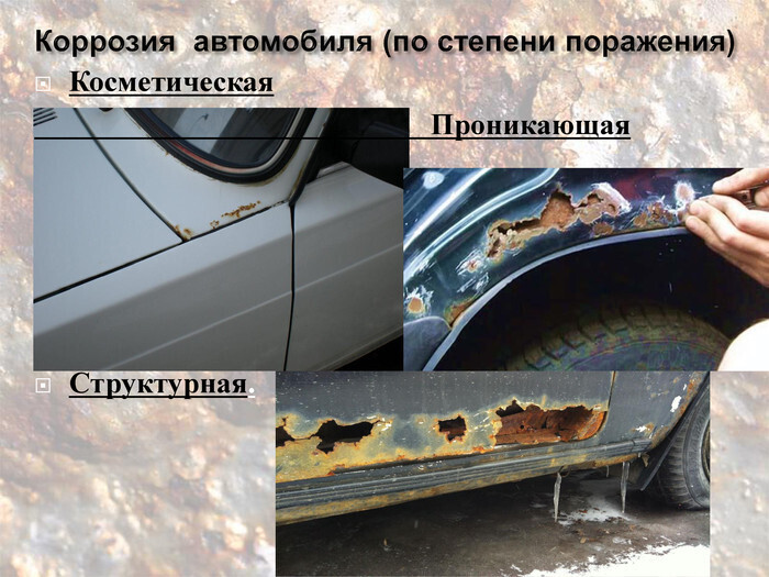 В первую очередь страдает днище автомобиля от постоянных повреждений. Летящие камни из-под колес, плохие дороги, нагрузка на кузов в связи с перевозкой грузов и частой эксплуатацией, наезды на бордюры. Причин повреждения много. Но ржавчина начинает свое пагубное воздействие в скрытых элементах автомобиля. На месте стыков и сварных швов, под лакокрасочным покрытием порогов и арок, в других труднодоступных местах. Это показывает важность регулярного (хотя бы раз в 3 года для автомобилей старше 5 лет) осмотра в СТО. - Зимний период. Небольшая царапина на кузове всего за одну зиму может превратиться в настоящий кошмар для автовладельца. Зимой дороги обрабатываются солями и химикатами, они попадают под лакокрасочное покрытие и моментально разъедают металлический кузов. Иногда коррозия на порогах и арках «проедает» металл практически насквозь всего за 2-3 месяца зимы. Высокая влажность, постоянные перепады температур только усугубляют ситуацию. От коррозии зимой машина страдает намного сильнее, даже новое транспортное средство может не выдержать воздействия химикатов.