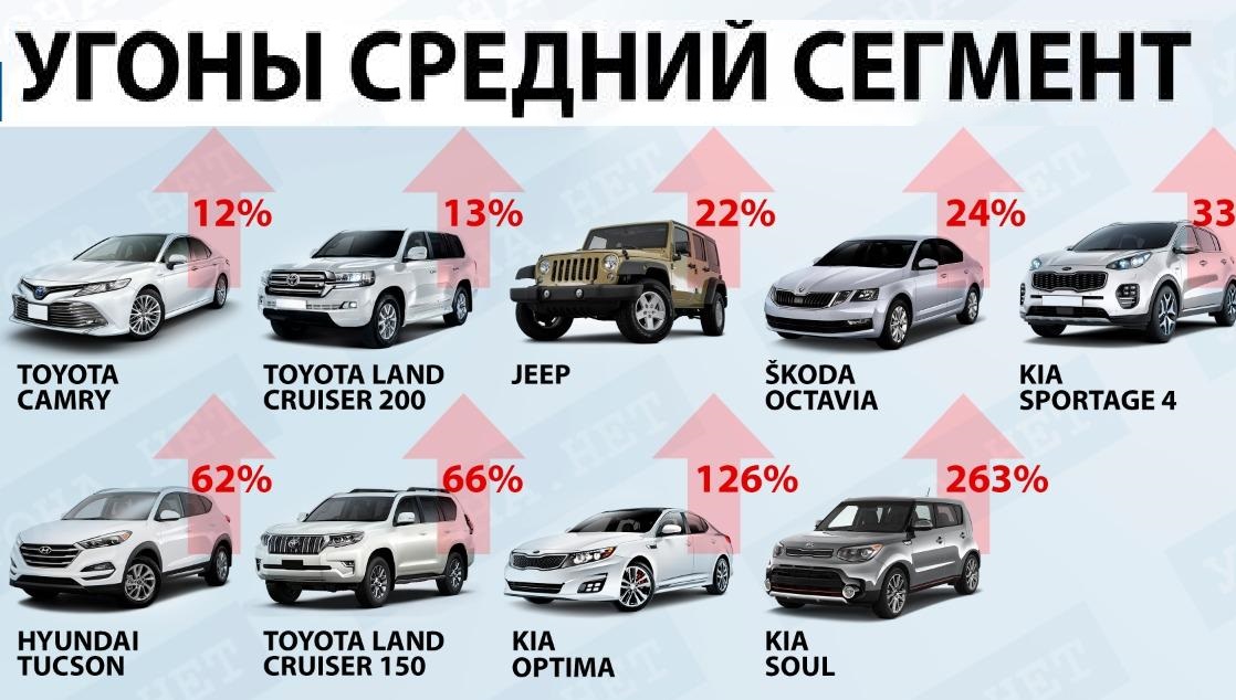 При этом за время весенней самоизоляции число угонов авто существенно снизилось, сообщали «Известия». В апреле по сравнению с мартом этот показатель упал на 53%. При этом больше всего (58%) угоняли личные автомобили в Санкт-Петербурге. На втором месте — Москва. Тогда самыми «популярными» для угонщиков марками были также Kia и Toyota. В 2017 году чаще всего угоняли отечественные машины LADA разных моделей.