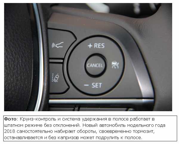 Руль и панель приборов Toyota Camry 2018Для всех моделей, начиная с 2017 года, конструкторы Toyota добавили систему безопасности Toyota Sense Safety в стандартную комплектацию. Camry 2018 не стала исключением. Комплекс включает в себя адаптивный круиз-контроль, автоматическое переключение света фар с дальнего на ближний и систему предупреждения о сходе с полосы движения (с функцией помощи в управлении). Также существует система предупреждения столкновения и опция обнаружения пешеходов, возможность автоматического экстренного торможения.