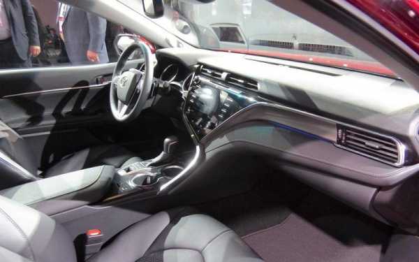 В придачу к привлекательной внешности прилагается шикарная отделка салона. Чего только стоит вид передней панели. Пространство водительского сидения по-прежнему украшает многофункциональный 4-спицевый руль с уже привычной приборной доской в виде 2 колодцев тахометра и спидометра и небольшим экраном бортового компьютера посередине. Асимметрия центральной части изменила представление о том, как должен выглядеть рядовой представитель среднего класса автомобилей. Она немного повернута к водителю и располагает 8-дюймовым сенсорным дисплеем мультимедийной системы Entune 3.0. Рядом с экраном находятся элементы управления климат-контроля. В качестве отделки служит мягкий пластик и дорогой материал.