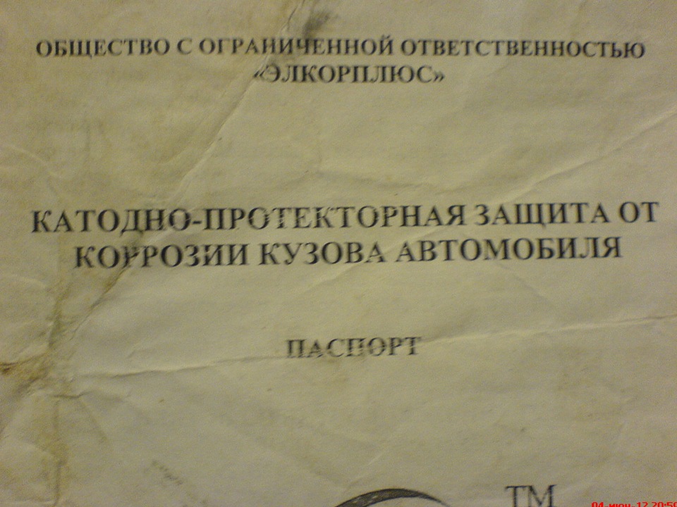 2) Коррозийных протекторов (двух пластин массой 500 гр. Каждой), закрепляемых по углам прямоугольника на днище автомобиля болтовым соединением. При этом месте контакта днища должно быть зачищено до металлического блеска.Гальваническая пара материалов днища и пластин создаёт ток, разрушающий пластины и защищающий кузов от коррозии. Один раз в два года необходимо очистить место контакта пластин и днища от грязи и выправлять напильником (или наждачной бумагой) образовавшиеся неровности на поверхности каждой пластины.